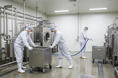 핵심 리스크 : 교차오염, 세척 밸리데이션 미흡, 작업자 세안·보호구 의무 불이행, 수막에 따른 미끄럼·화학물 노출 사고